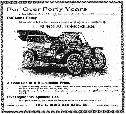 We've all heard names like Ford, Olds, and Buick, but there were other automotive pioneers who worked right here in Western Illinois. Take Louis Burg of Dallas City. He had owned a carriage company for several years before he started buying parts to make cars. By 1910, he was employing 40 people in his factory in Henderson County. Just up the road from Mr. Burg, they were making the Lomax Auto in, you guessed it, Lomax.