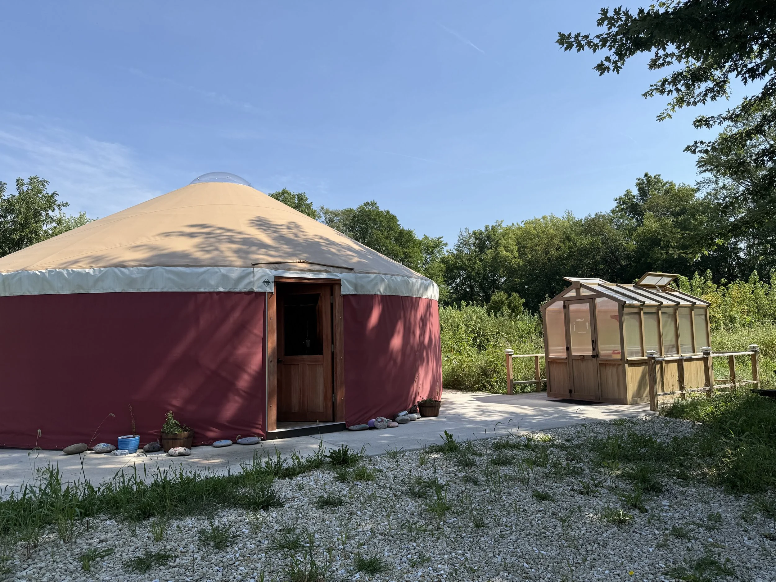 The yurt is utilized throughout the year to educate students on farm projects and nature. On the right is their miniature greenhouse.
