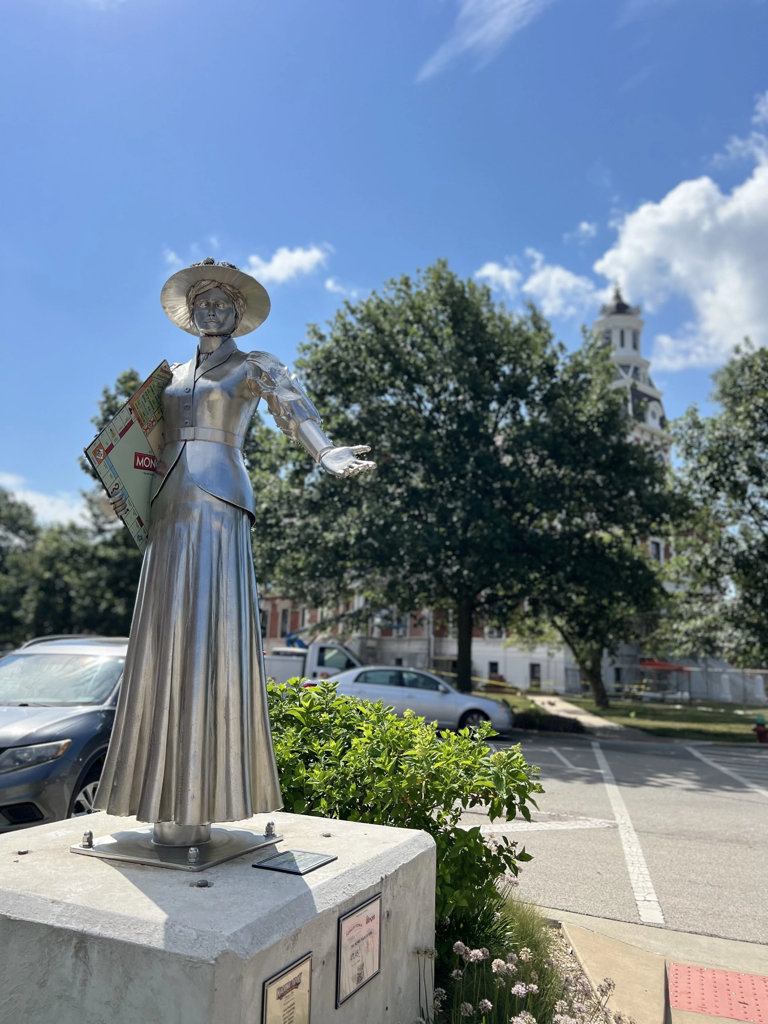 The largest and most interactive Monopoly game to date debuted on May 9th. In the heart of Macomb’s downtown square are oversized sculptures of spinning dice, a gameboard, a stovepipe hat, and a statue of the creator herself.
